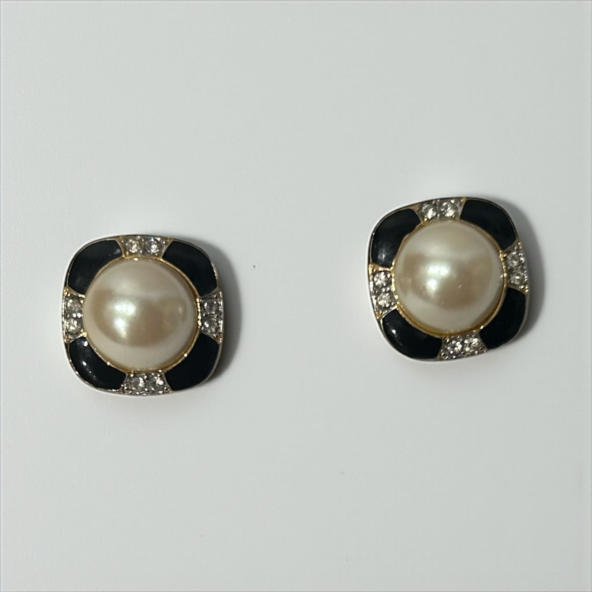 עגילי וינטג’ משנות ה-80 בעיצוב ריבועי מעוגל, עם פנינה מרכזית גדולה וסביבה שילוב של אמייל שחור וקריסטלים.