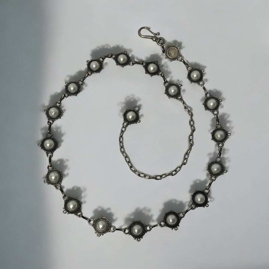 חגורת שרשרת כסופה בשילוב פנינים בסטייל בוהו