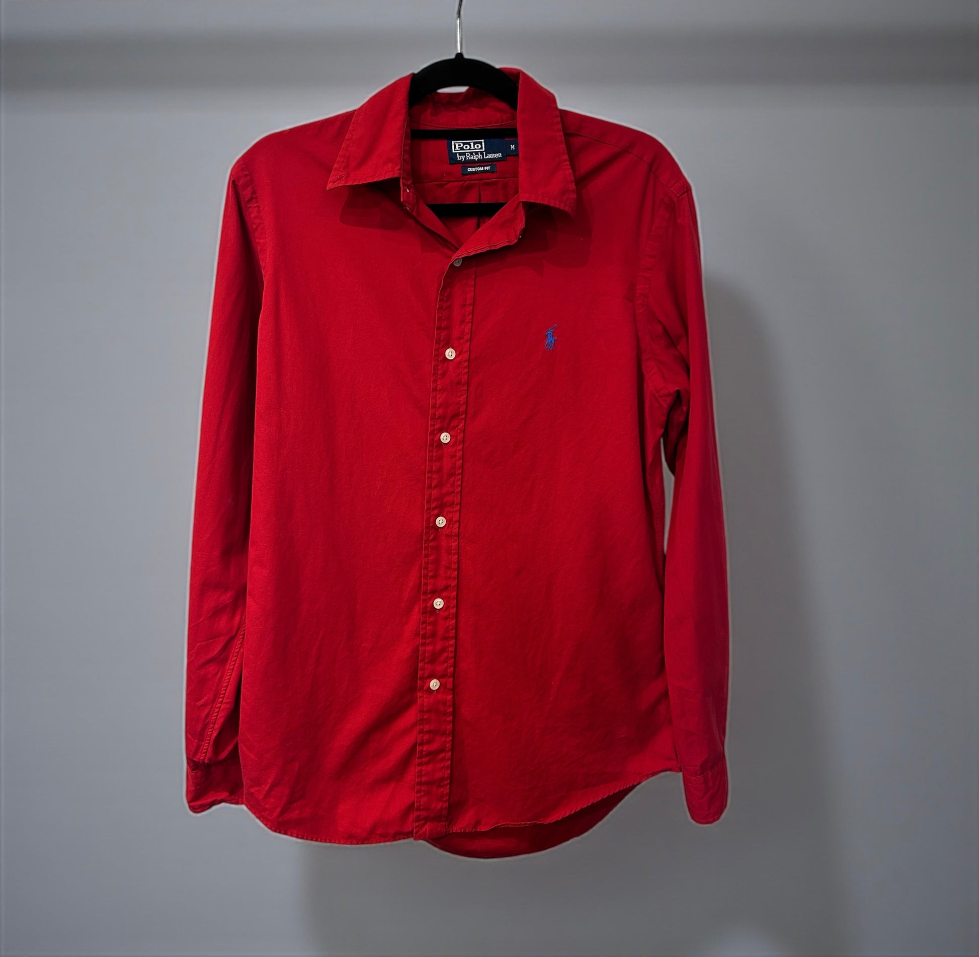 חולצת כפתורים וינטג’ מבית האופנה האמריקאי Polo Ralph Lauren, בצבע אדום עם סמל הרוכב האייקוני רקום בגוון כחול רויאל על החזה.
