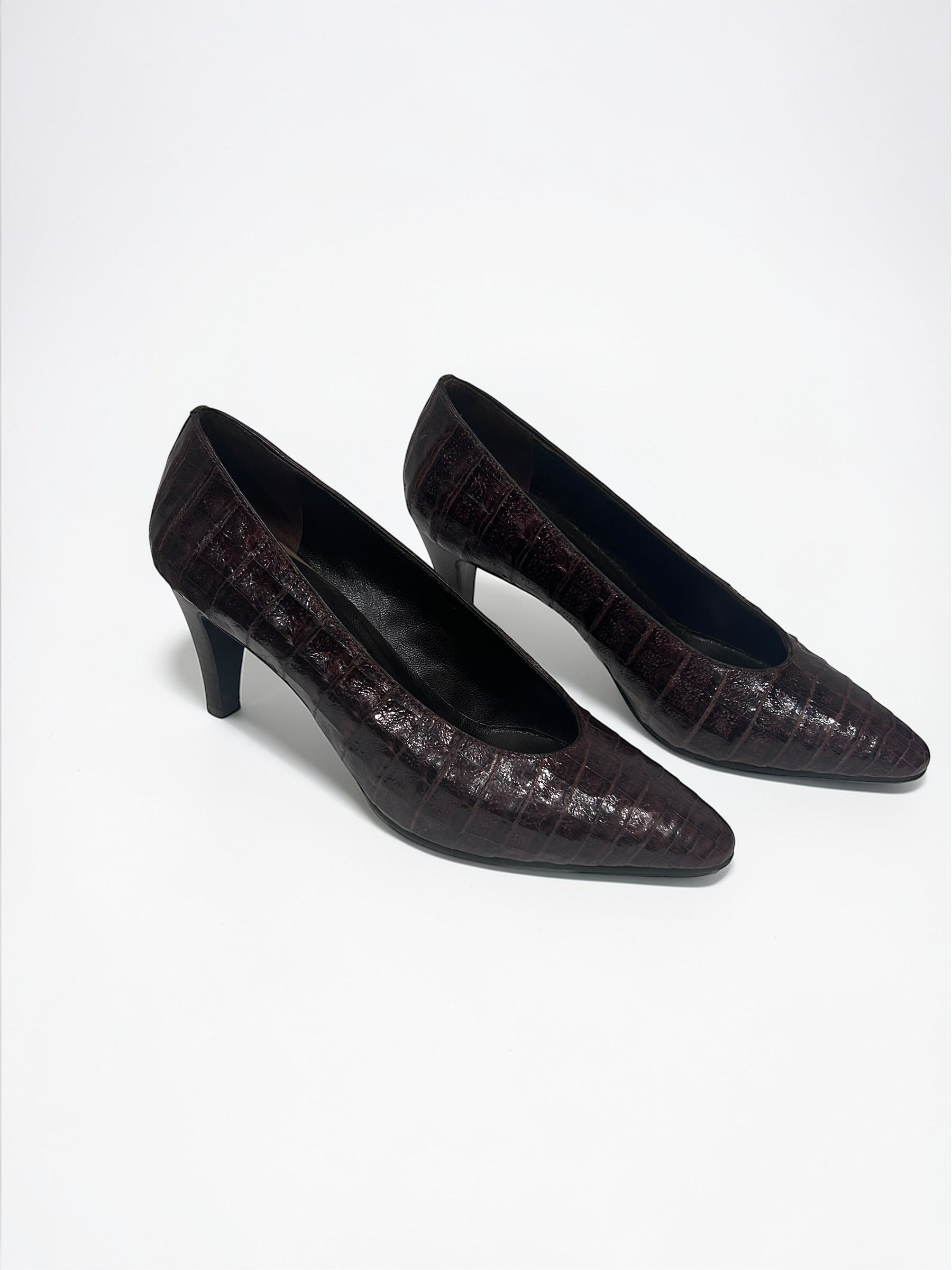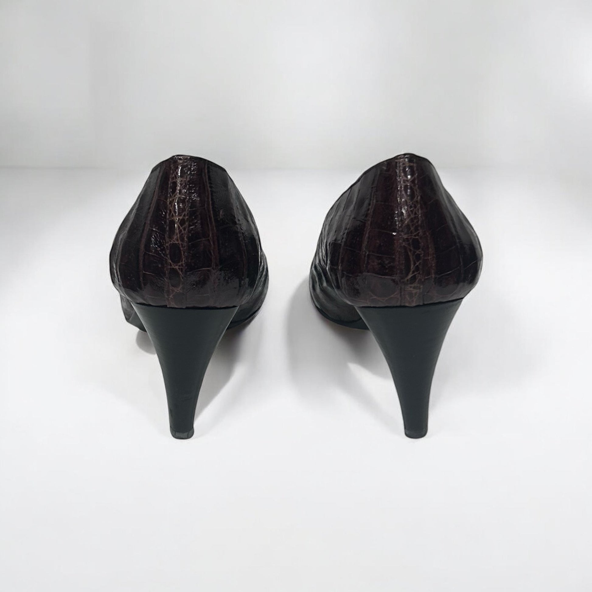 נעלי עקב מבית האופנה האיטלקי Prada Milano, עשויות עור איכותי בגימור קרוקו בצבע חום עמוק.