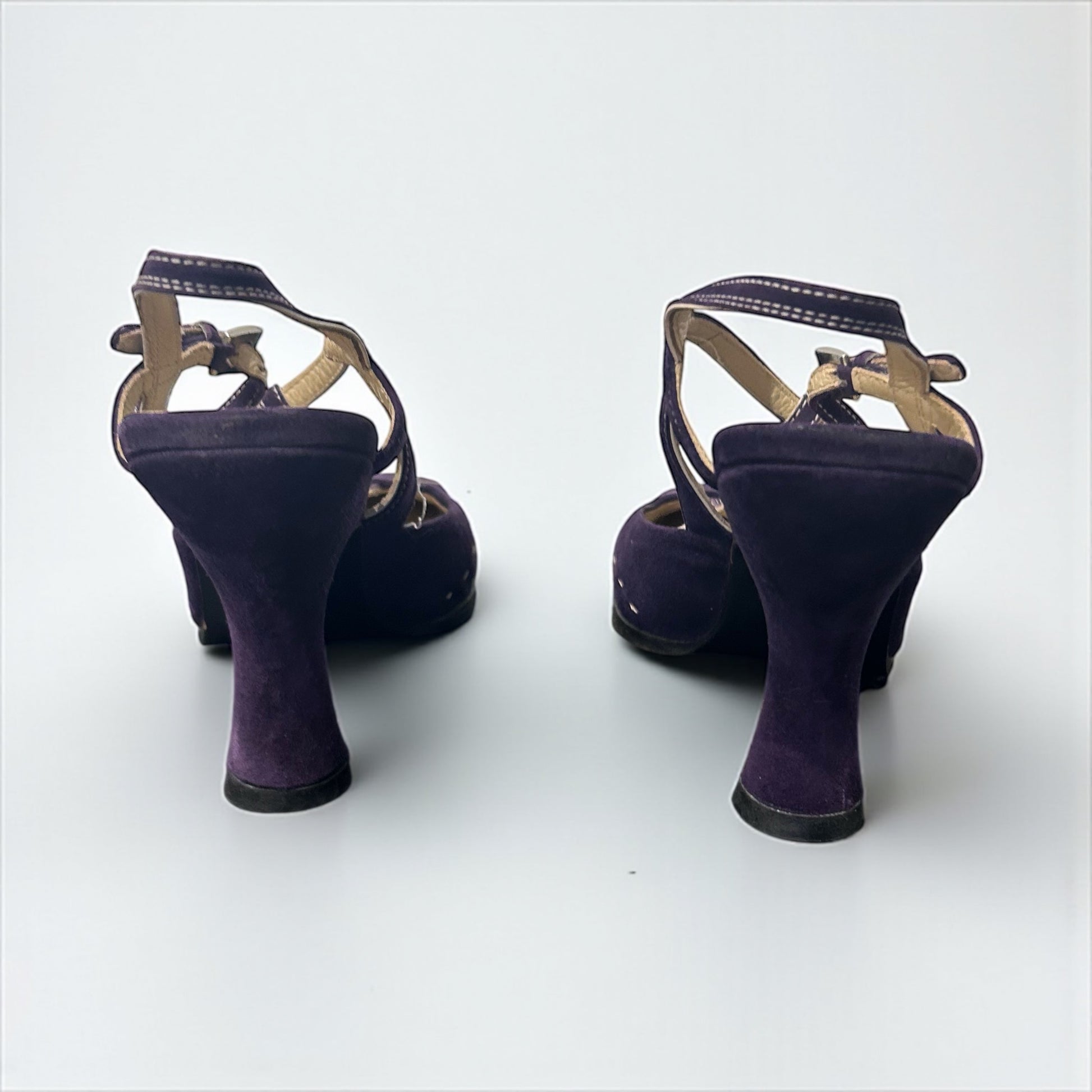 עשויות זמש סגול עמוק, עם תפרי ניגוד לבנים וסגירה אחורית בסגנון slingback