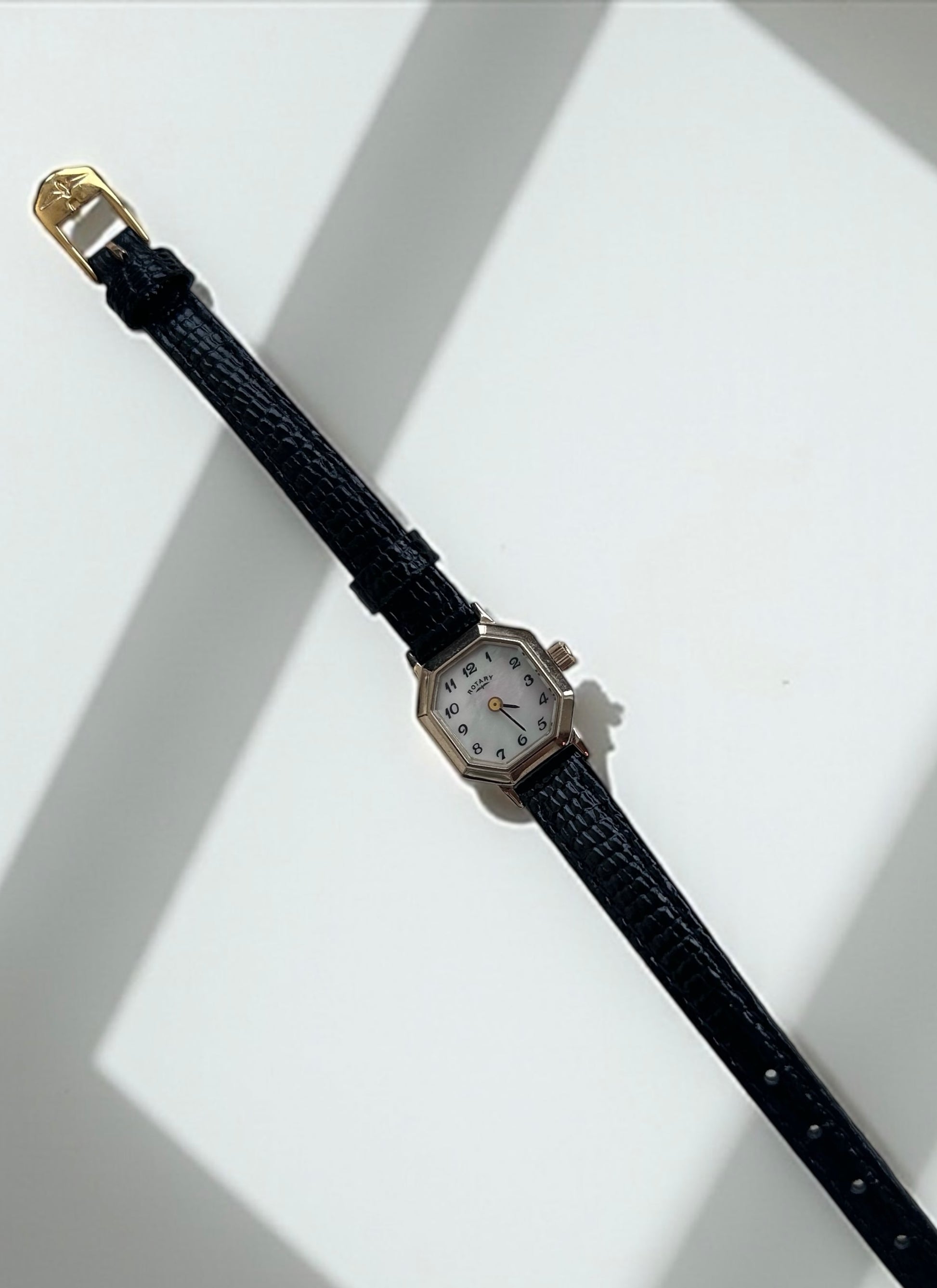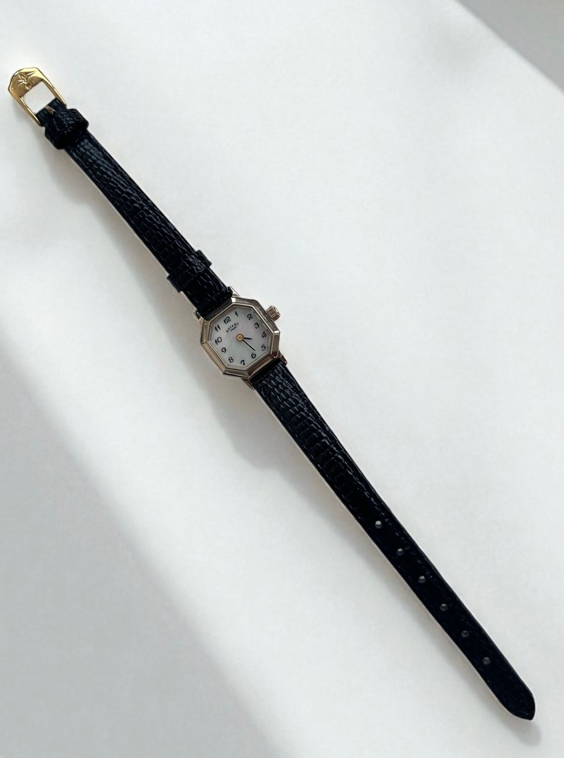 גוף השעון בצורת מתומן ייחודי בגימור מוזהב עדין.