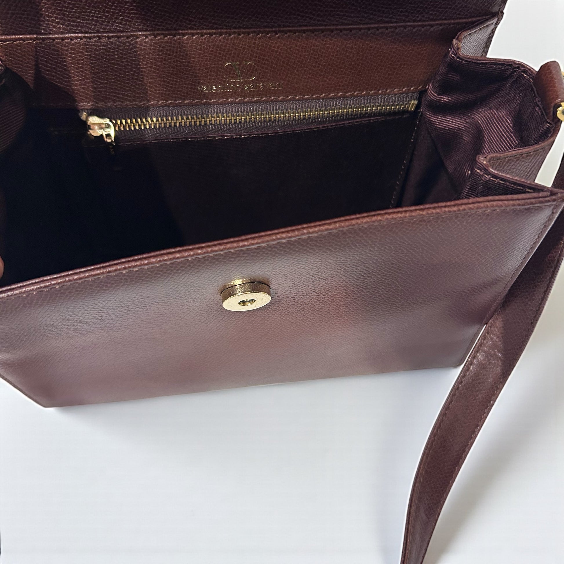 תיק וינטג’ מבית האופנה האיטלקי Valentino, עשוי עור איכותי בצבע חום כהה עמוק עם טקסטורה עדינה ומראה קלאסי על־זמני.