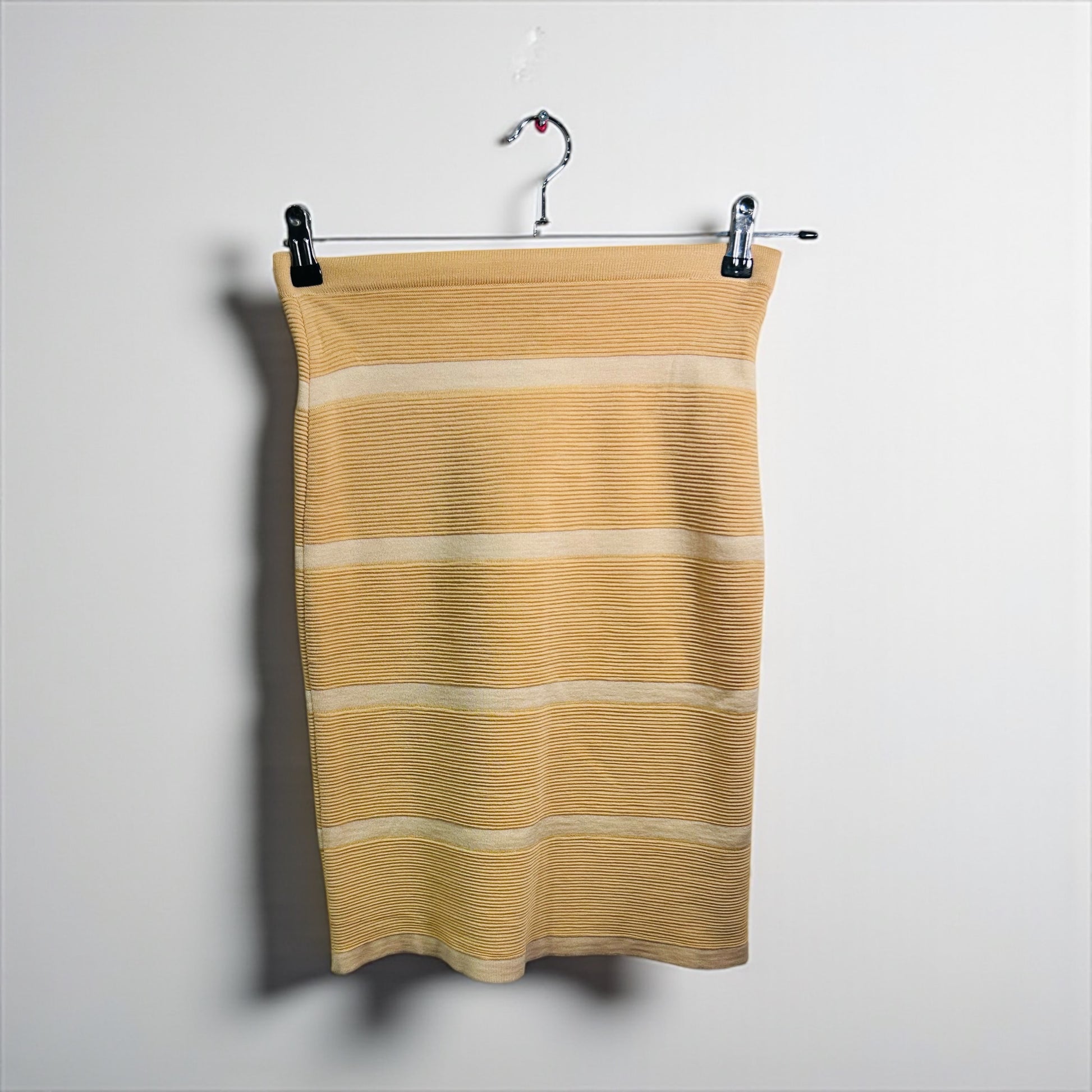 חצאית וינטג’ קלאסית מבית Valentino Garavani, ליין ה־Les Tricots היוקרתי. עשויה סריג ריב דק באיכות גבוהה, בגוון חרדל בהיר בשילוב פסים אופקיים בהירים יותר