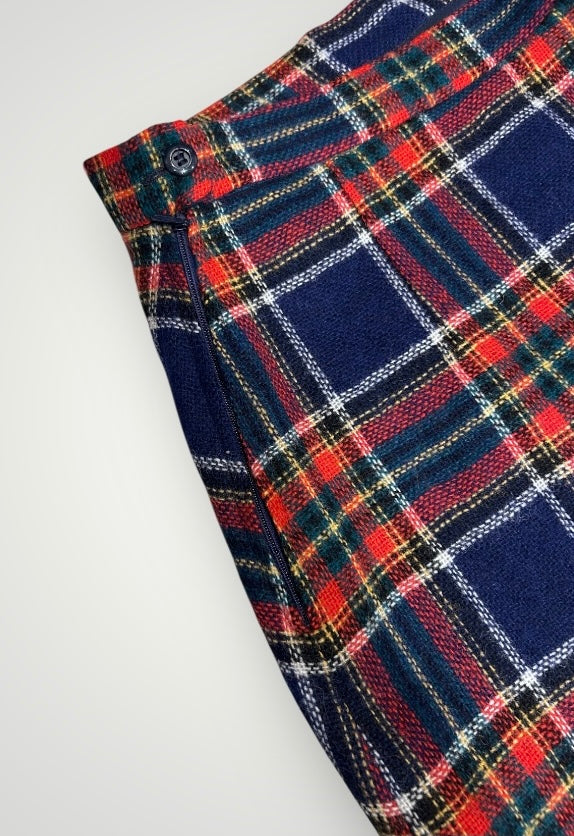 חצאית וינטג’ קלאסית משנות ה־80, עשויה צמר איכותי בדוגמת טארטן משובץ בגווני כחול, אדום וירוק.
