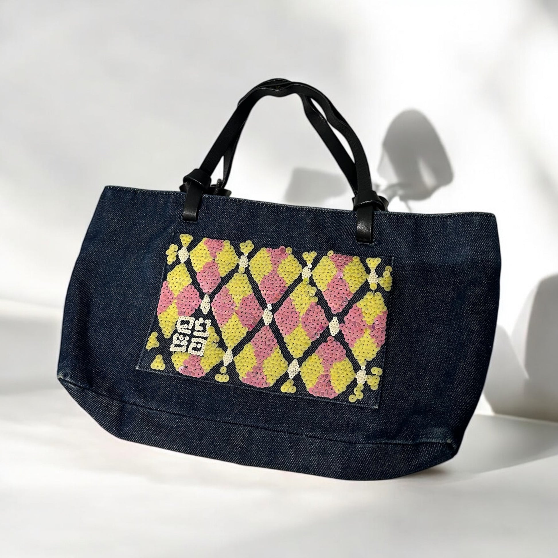 התיק עשוי ג׳ינס , עם קישוט של הלוגו בפאייטים בצבעי לבן, ורוד וצהוב. יש לו רצועת עור כפולה בצבע שחור לנשיאה נוחה .
