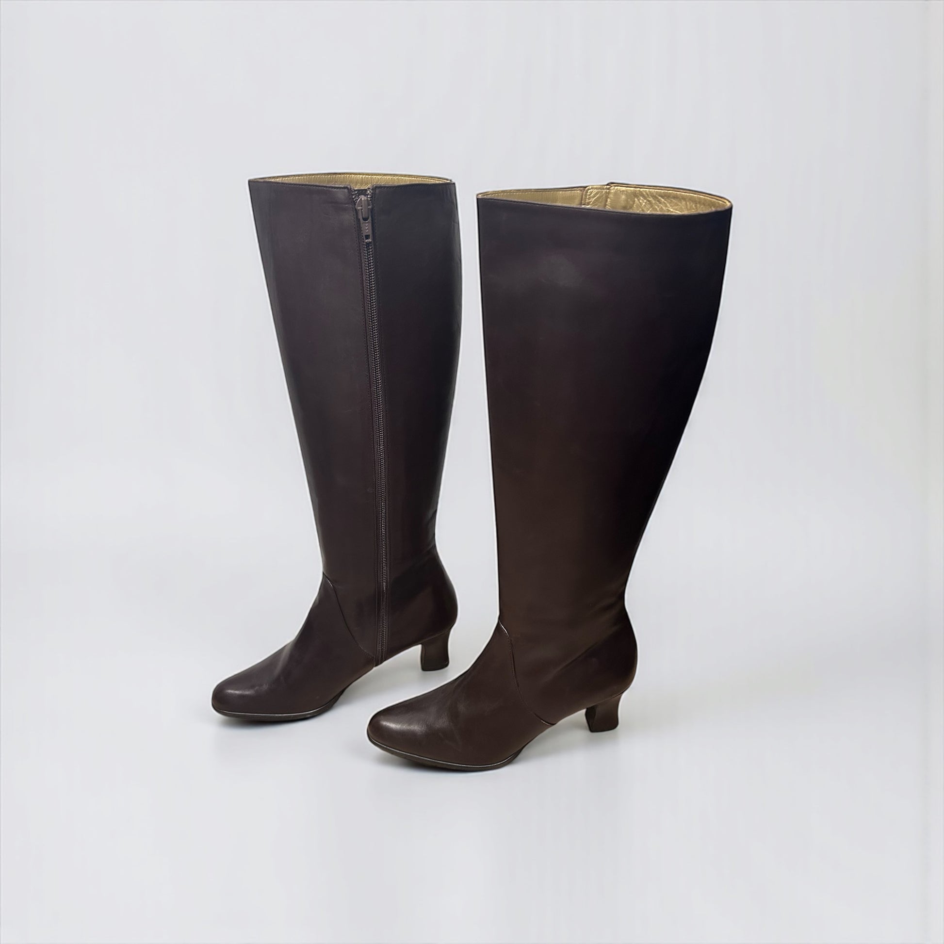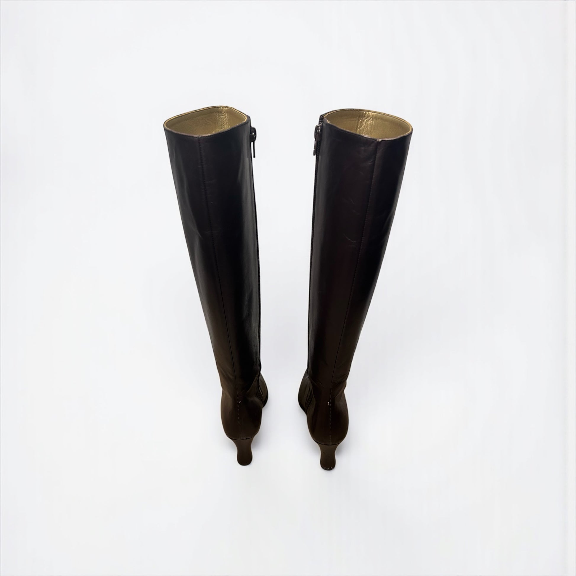 מגפי עור בגוון חום שוקולד עמוק מבית האופנה Yves Saint Laurent משנות ה-90 , בעיצוב על-זמני.